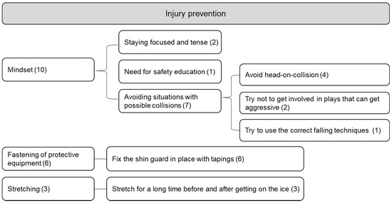 For responses of preventing injuries (Figure 3), mindset, stretching, and fastening of protective equipment were classified as three categories. Interviewees emphasized a mindset involved in staying focused and tense, the necessity for safety education, and avoiding collision circumstance. In order to avoid collision, P3 and P4, with 10 years of ice hockey experience, described how they intentionally fall on areas that are well-protected in order to avoid head-on-collisions. They pointed out the decrease in frequency of injuries compared to when they were beginners. Thus, the ability to react proficiently to risk of injury varies based on one’s experience and skills. Additionally, they highlighted their habits of adding taping and banding in order to secure on the shin guards. While the equipment usually allows for safe games, knee injuries can result from shin and elbow guards sliding down and around. In addition, based on such experiences, participants explained how they made sure to stretch and relax the body enough before playing.