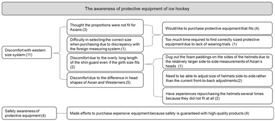 The respondents were asked to freely describe their opinions at the end of the survey. Thirty-eight out of one hundred two participants offered their impression. Table 6 represents the analytical results using ‘open coding method’. Size, management, wearing, the protective level of equipment, and price for the ice hockey protective equipment were classified. The protective level of equipment has a positive correlation with the price, and respondents believe that more expensive equipment is more comfortable (n = 12, 31.6%). In addition, they expressed discomfort due to the heavy weight and how the elbow pad or the shin guard would slip down (n = 13, 34.2%). For the size, participants felt that the ice hockey equipment being mostly from overseas was too large for the Korean measurements. Along with the fact that the equipment was too big on the body, the inability to try the equipment on was also noted (n = 10, 26.3%).