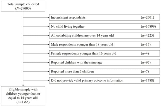 During the study period, 29,000 respondents (response rate 12.9%) answered the questionnaires. We excluded 2601 individuals who reported unnatural or inconsistent responses using an algorithm we developed, which left 26,399 respondents (91.0% of the total survey respondents). Among the 26,399 respondents, we excluded 21,124 respondents who reported that they had no child (n = 16,899), or that all their children were over 14 years old (n = 4225). Then, we excluded 19 outliers who were younger than the age at which people are allowed to be legally married, that is, 18 years old for men (n = 15) and 16 years old for women (n = 4). Furthermore, 96 respondents with two or more children of the same age were excluded because we could not assume which child the participants answered for in the questions of interest. Moreover, we excluded seven respondents who reported that they had more than five children because the maximum number of children that the respondents could answer for was five due to the survey structure as they might have failed to provide the appropriate outcome variable; we thus included 5153 respondents at this step. Lastly, we excluded 1788 respondents due to invalid primary-outcome information. As a result, we analyzed 3365 participants in the present study (Figure 1).