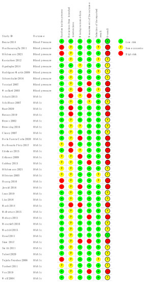 For the domain missing outcome data, four studies were rated as high risk of bias due to high and unbalanced dropout rates, suggesting that the loss of follow-up was related to the intervention [38,45,48,54].