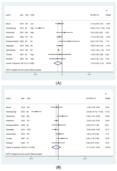 Meta-analysis of the effect of NT on blood pressure in patients primarily diagnosed with hypertension. (A) Diastolic blood pressure, (B) Systolic blood pressure.