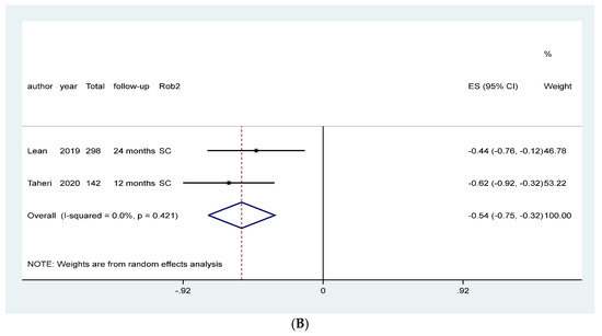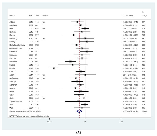 Meta-analysis of studies assessing the effect of counseling and educational programs on HBA1c favored the intervention (MD: −0.37, 95% CI: −0.57, −0.17, I2: 85.8%, 7437 patients, 27 studies, moderate quality of the evidence, Figure 4A). We investigated heterogeneity using meta-regression. The joint and individual tests for categorical and no categorical covariates gave us a p-value higher than 0.05, indicating no association between these covariates and the size of the treatment effect (Figures S6 and S7 on the Supplementary material). However, through visual inspection of the forest plot, we asserted that two studies overestimated the effect of the intervention [43,45]. A sensitivity meta-analysis excluding these two studies resolved the heterogeneity and still favored the intervention (MD: −0.25, 95% CI: −0.35, −0.16, I2: 24%, 7094 patients, 25 studies, Figure S8 on the Supplementary material).