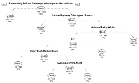In machine learning, a Decision Tree (DT) is a supervised learning method, while a Classification and Regression Tree (CART) is one of the algorithms under this category, either as a non-parametric classification method or as a non-parametric regression one [13]. When the dependent variable is continuous, the generated tree is a regression tree, but when it is discrete, a classification tree is generated. The major difference between CART and other algorithms under DT is that the tree built by CART is necessarily a binary tree [35,57]. In other words, no matter what type of decision tree is used, or how many values the characteristic variables have, each node can only be split into two child nodes based on the relationship between the value of the variable and the discriminant rule, where the one that satisfies the rule is “yes” and the one that does not is “no”. In general, the left branch of the tree generated corresponds to the branch with “yes” feedback, while the right branch corresponds to the one with “no” feedback. By recursively splitting each characteristic node according to such rules until there are no further splits that can be made, a decision tree based on CART can be obtained [13,35]. Based on the tree-building process presented above, it can be concluded that the CART algorithm is relatively simple compared with the previous logistic regression models [20,57]. Since the dependent variable in this study is a discrete one that is either death or injury, the decision tree generated using CART is a classification tree. Subsequently, it is sometimes necessary to prune the trees based on the classification results, as well as to select the optimal tree [13,35,57].