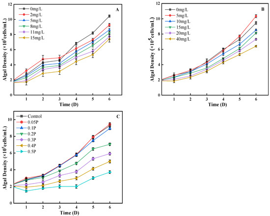 The experiment period was 6 days, with 1 blank group and 5 experimental groups. In the experiment, C. pyrenoidosa liquid was used in the logarithmic growth phase, and the initial density of C. pyrenoidosa was 2.0 × 105 cells/mL; then, the mother solution of BPA was added and placed in 250 mL triangular vials. The culture volume was 170 mL, and the concentrations of BPA were 2.0, 5.0, 8.0, 11.0, and 15.0 mg/L. It was verified that BPA had a toxic effect on algal species under the concentration system. Then, they were exposed for 6 days in a biochemical incubator with illumination from 14,000 to 17,000 lx and a light:dark cycle of 12 h:12 h. These steps were repeated 3 times for each test concentration. The position of the triangular bottles in the illumination incubator was changed regularly every day to ensure that all of the bottles received uniform light. After the exposure experiment, the cell density and chlorophyll a content of the algae liquid were measured regularly every day. The contents of MDA, POD, SOD, and BPA in the culture medium were determined on the 6th day.