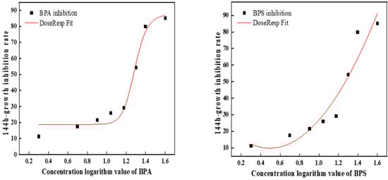 In the EC50 experiment for BPA, there were 9 concentration gradients of 0, 2, 5, 8, 11, 15, 20, 25, and 40 mg/L. In the EC50 experiment for BPS, 9 concentration gradients of 0, 5, 10, 15, 20, 40, 50, 60, and 70 mg/L were set. Samples were taken on the 6th day, the density of algal cells was measured, and the growth inhibition rate was calculated compared with the blank control. The logarithmic value of the tested substances was the abscissa, and the inhibition rate of growth was the ordinate. The 144 h EC50 values of BPA and BPS were obtained via Origin software fitting.