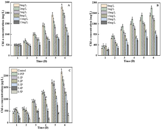 Effects of BPA, BPS, and BPA + BPS on Chl-a of C. pyrenoidosa: (A,B) show the effects of single BPA and BPS on Chl-a content; (C) shows the effects of joint BPA and BPS toxicity on Chl-a content. Note: Data are means ± SD of the three replicates. Different lowercase letters indicate significant differences between the treatments (p < 0.05).