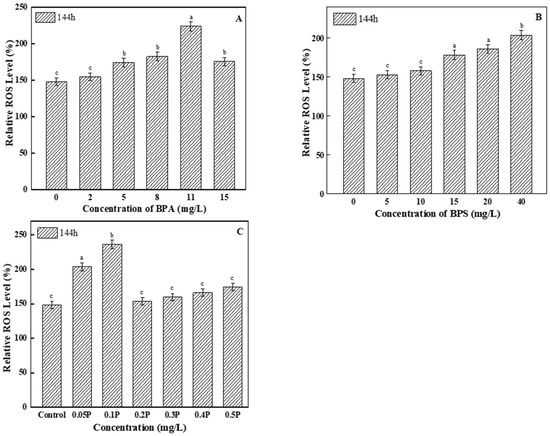 Effects of BPA, BPS, and BPA + BPS on the ROS levels of C. pyrenoidosa: (A,B) show the effects of single BPA and BPS on ROS levels; (C) shows the effects of joint BPA and BPS toxicity on ROS levels. Note: Data are means ± SD of the three replicates. Different lowercase letters indicate significant differences between the treatments (p < 0.05).