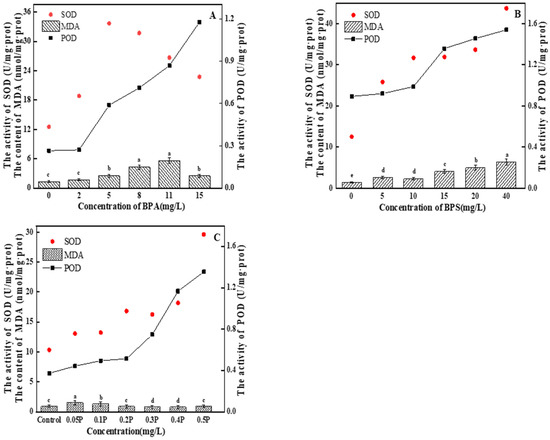 (A–C) represent the effects of BPA, BPS, and BPA + BPS, respectively, on the intracellular MDA content, and the POD and SOD activity, in C. pyrenoidosa. Note: Data are means ± SD of the three replicates. Different lowercase letters indicate significant differences between the treatments (p < 0.05).