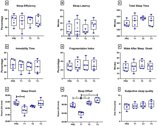 Whisker plot with single data (blue circles) of median, first, and third quartiles and minimum and maximum values of actigraphy-based (panels A–H) and subjective (panel I) sleep parameters before ATC (PRE), the first two days of ATC (T1), and after one week (T2) and two weeks of ATC (T3). *: p < 0.05; **: p < 0.01.