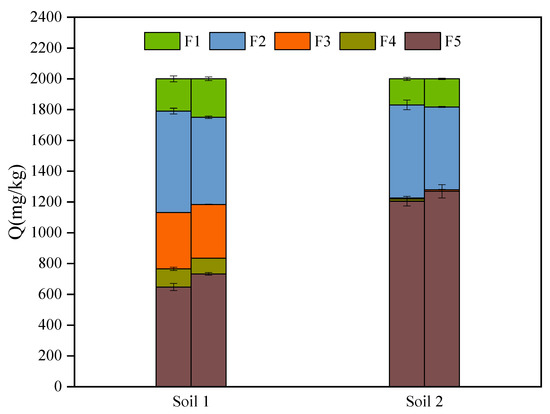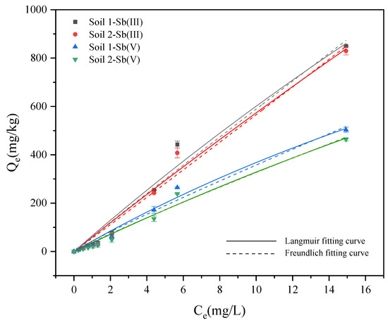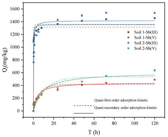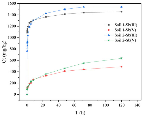 As shown in Figure 1, the adsorption capacity of Sb onto two soils increased rapidly with time within 8 h, which was in the fast adsorption stage. Then, the adsorption capacity of Sb increased slowly after 8 h. After 24 h, the adsorption of Sb (III) gradually reached equilibrium. After 72 h, the adsorption of Sb (V) gradually reached equilibrium. In addition, the adsorption rate of Sb onto soil 1 was greater than that of soil 2, but the adsorption capacity of Sb onto soil 1 was smaller than that of soil 2. The clay colloid percentage of soil 1 was higher, which means soil 1 had more specific surface area and adsorption sites, which led to a higher adsorption rate than soil 2 in the rapid adsorption stage [31,35]. The equilibrium adsorption capacity might be related to the presence of calcium oxide, aluminum oxide, iron oxide, and manganese oxide [34,40,41,42,43,44].
