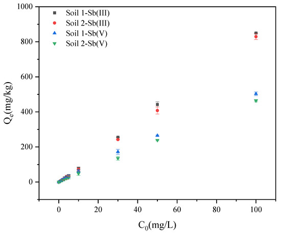 As shown in Figure 2, with the increase of the initial concentration, more ions appeared in the solution for the exchange reaction, which increased the adsorption capacity of the soils at equilibrium. The adsorption capacity of Sb (III) in soils was higher than that of Sb (V) at equilibrium. In addition, the difference between the equilibrium adsorption capacity of Sb (III) and Sb (V) gradually increased.