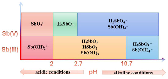 As shown in Figure 3, Sb (III) existed as neutral molecules such as Sb (OH)3, H3SbO3, or HSbO2 in the pH range of 2–10.7 and existed as SbO+ or Sb (OH)2+ under strong acid conditions [45]. In a strong alkaline environment, it existed as SbO2− or Sb (OH)4−, and only as Sb3+ under extremely acidic conditions. Sb (V) existed as Sb (OH)6−, H2SbO4−, or SbO3− under weak acid, neutral, and alkaline, and it would exist in the form of SbO2− under strong acid conditions.