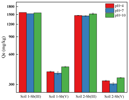 Briefly, 200 mg/L Sb (III) and Sb (V) solutions were prepared at room temperature (25 °C). The pH of the solution was adjusted to 4, 7, and 10 with NaOH and HCl. Hence, 2.0000 g of soils were added to a 50 mL plastic centrifuge tube. The KCl concentration, soil/water ratio, and shaking time were the same as in Section 2.2.1.
