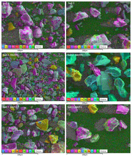 Under a soil/water ratio of 1:10 and the initial Sb concentration of 2000 mg/L, the element distribution on soil surfaces scanned by SEM mapping are shown in Figure 8.