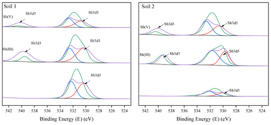 To better understand the adsorption behavior of Sb, its surface chemical binding states in soils were analyzed through XPS results. It was clearly seen from Figure 9 that before Sb (III) and Sb (V) adsorption, XPS spectrums of soil 1 and soil 2 could be divided into Sb3d5 at the peak of 530.7 ev. After the adsorption, the XPS spectrum of the soils could be deconvoluted into Sb3d3 and Sb3d5, representing Sb (III) and Sb (V) at the peaks of 530.7 ev and 540.1 ev. The results implied that the redox reactions might accompany the changes in Sb valences during the adsorption. The reduction of Sb (V) to Sb (III) in soils has been shown to occur with the ferrous iron [59], while the oxidation is enhanced by Fe/Mn oxyhydroxides present in natural soils [46] and the reactive oxygen species (ROS), including hydroxyl (·OH), peroxyl radicals (·ROO), hydrogen peroxide (H2O2), and superoxide radical anion (·O2−) in groundwater [60]. Besides, pH had an effect on the redox rate of Sb [31,35,36].