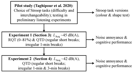 In this study, two experiments were conducted to investigate the effects of the two independent macro-temporal pattern variables “relative quiet time” and “quiet time distribution” (cf. Section 2.3) on short-term noise annoyance and cognitive performance in a task which predominantly relies on attentional functions: the Stroop task [42]. Experiment 1 investigated the individual and combined effects of the two variables, while experiment 2 focused on the effect of quiet time distribution in more detail. Two different versions of the Stroop task, derived from the colour test [42] and shape test [43], were used (Section 2.2). The latter were identified as suitable in a pilot study to this paper [44], where (i) the difficulty of Stroop tasks necessary for the framework of our study was assessed, (ii) interchangeable Stroop tasks were identified, and (iii) the chosen tasks were applied in a preliminary listening experiment to test their feasibility. The pilot study is described in detail in [44]. Figure 1 gives an overview of the workflow of the experiments.