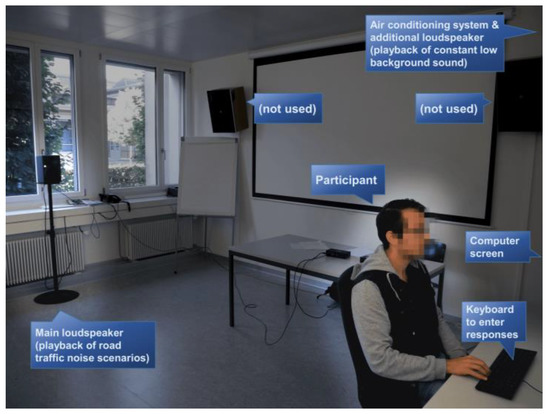 In the present study, the participants conducted a visually presented cognitive task, while road traffic noise scenarios were played back. The participants’ primary focus was thus on the cognitive task and not on the noise scenarios. However, at the end of each noise scenario, the participants rated their noise annoyance. As laboratory setup, an office environment was chosen where an open window was simulated from which the road traffic noise would enter the office (Figure 2). To that aim, a loudspeaker playing back road traffic noise scenarios was placed in front of the closed window. For the experiments, moderate exposure scenarios with LAeq of 42–45 dB(A) were chosen, which are representative values for an office environment. The daytime limit value (impact threshold) for road traffic noise of 60 dB outdoors in residential zones according to Swiss legislation [51] and a sound level attenuation during transmission from the outside to the inside of some −15 dB for tilted windows [52,53] approximately result in the above indoor LAeq. Likewise, a road traffic noise Lden of 53 dB according to the recommendation of WHO [6], corresponding to a daytime LAeq of ~51 dB(A) [54], and a sound level attenuation during transmission from the outside to the inside of some −10 dB for open windows [53] lead to similar values. Besides the actual noise scenarios, constant low background sound was played back with an additional loudspeaker (cf. Section 3.1).