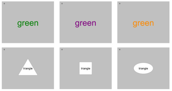 - Gier, V.S.; Kreiner, D.S.; Solso, R.L.; Cox, S.L. The hemispheric lateralization for processing geometric word/shape combinations: The Stroop-shape effect. J. Gen. Psychol. 2010, 137, 1–19. [Google Scholar] [CrossRef] [PubMed]