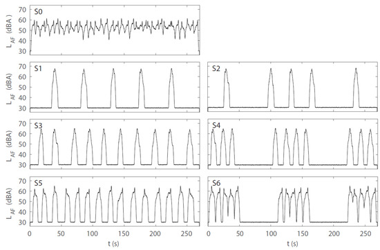 A-weighted and FAST-time weighted level-time histories (LAF) of the road traffic noise scenarios in experiment 1. S0–S6 refer to scenario 0 (reference) to 6 (cf. Table 1).