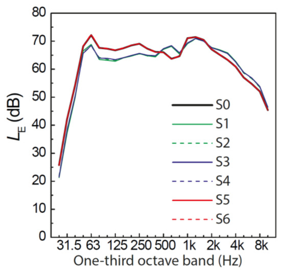 One-third octave spectra of the road traffic noise scenarios in experiment 1. S0–S6 refer to scenario 0 (reference) to 6 (cf. Table 1).