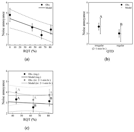 Noise annoyance as a function of (a) relative quiet time (RQT), (b) quiet time distribution (QTD) and (c) both RQT and QTD as found in experiment 1. Circles represent mean observed values (Obs.) with standard error bars, and lines the corresponding mixed-effects models with 95% confidence intervals, in (b) as horizontal lines with confidence intervals. In (b,c), significant differences between estimated marginal means (p < 0.05; pairwise comparisons with Bonferroni correction) of regular and irregular QTD are indicated by differing letters.