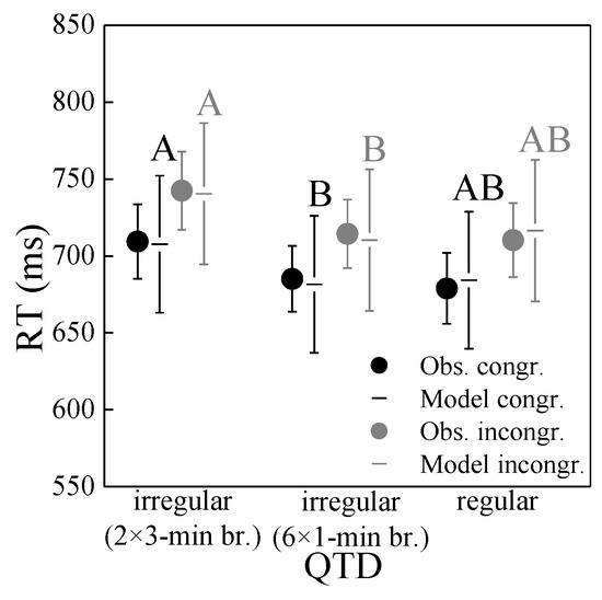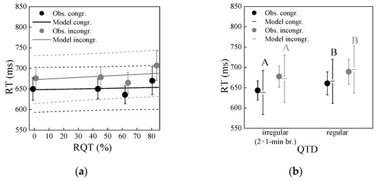 Reaction time (RT) as a function of (a) relative quiet time (RQT) and (b) quiet time distribution (QTD), for the congruent and incongruent items of the Stroop task in experiment 1. Circles represent mean observed values (Obs.) with standard error bars, and lines the corresponding mixed-effects models with 95% confidence intervals, in (b) as horizontal lines with confidence intervals. In (b), significant differences between estimated marginal means (p < 0.05; pairwise comparisons with Bonferroni correction, performed separately for the congruent and incongruent items) of regular and irregular QTD are indicated by differing letters.