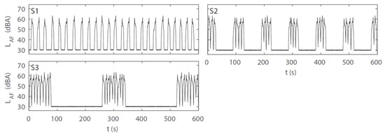 A-weighted and FAST-time weighted level-time histories (LAF) of the road traffic noise scenarios in experiment 2. S1–S3 refer to noise scenario 1–3 (cf. Table 5).