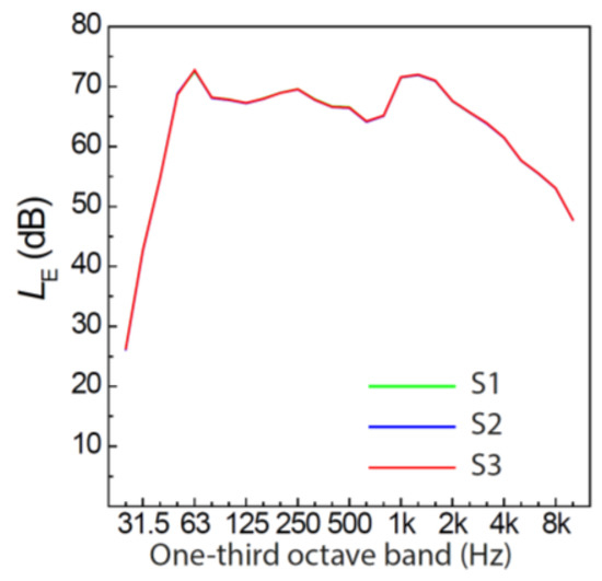 One-third octave spectra of the road traffic noise scenarios in experiment 2. S1–S3 refer to noise scenario 1–3 (cf. Table 5). Note that the three spectra are identical because the same car pass-by events were used to generate the three scenarios.