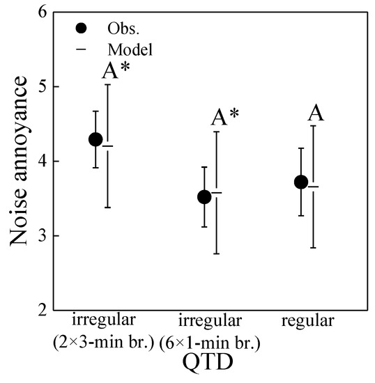 Linear mixed-effects modelling analysis confirmed these observations and significant differences between regular and irregular QTD (cf. Figure 6b,c). Here, two models are reported, which either relate annoyance to RQT (model MRQT) or to QTD (model MQDT). The first model, MRQT, reveals the dependence of annoyance on the continuous variables RQT and playback number (PN). This model takes into account all noise scenarios, S0–S6.