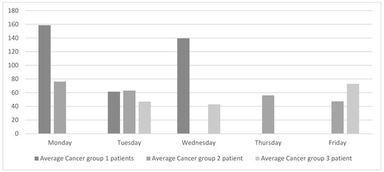 The analysis of the current state was complemented by collecting data on oncology patients visiting the oncologist each day of the week. The data were classified into cancer groups as shown in Figure 3. Patients in group 1 are generally on short treatments and the chemotherapy treatments take between 15 and 40 min. The chemotherapy treatments for patients in group 2 have an average duration of 2.5 h, and the treatments for patients in group 3 are the longest and last between 3.5 and 4 h.