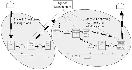 On the one hand, Figure 1 exposes how the processes of preparation and administration of chemotherapy have variable durations (max., min., and medium). For these processes, the average duration is weighted based on the number of patients of the different types of cancer and the duration of their respective treatment. On the other hand, the duration for taking blood samples, testing the samples, and medical consultations is more stable, so the average duration is directly calculated.