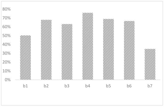 Figure 1 shows the adoption of farmers’ climate-responsive behaviors. From the left to the right: planting-breeding combination methods (b1), conservation tillage methods (b2), use of organic fertilizers (b3), the change of suitable varieties according to the frost-free periods (b4), adjustment of pesticides and fertilizer usage (b5), adjustment of the time of sowing and harvesting (b6), filling the gaps with seedlings (b7), respectively.behaviors. Among the farmers being surveyed, changing suitable planting varieties according to the frost-free periods is the most used method, followed by adjusting pesticides and fertilizers usage. Conservation tillage is commonly used in low-carbon production practice, which also shows that the promotion of conservation tillage is effective.
