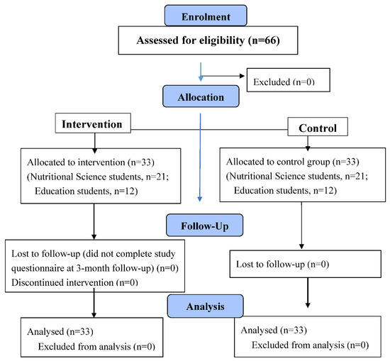 A total of 66 third-year college students (mean age 26.3) participated in the study. In total, 24 students (36%) were Education majors, and 42 students (64%) were Nutritional Sciences majors, with 33 participants in each study group (Figure 1). All eligible participants completed all assessments’ questionnaires. A total of 99% of the facilitators were women. The study population’s personal and sociodemographic characteristics are displayed in Table 2. No differences in age, gender, parental status, or socioeconomic status were found between the facilitator and the comparison groups.