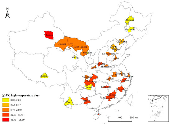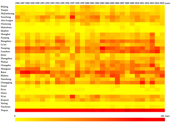 Number of high-temperature days (≥35 °C) in 31 typical Chinese cities from 1986 to 2015.