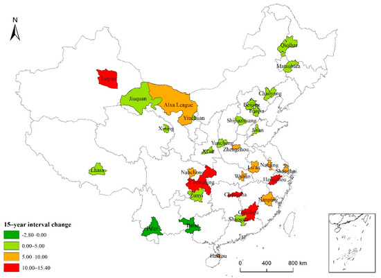 Map of China showing the 15-year interval variation of high-temperature weather in typical cities.