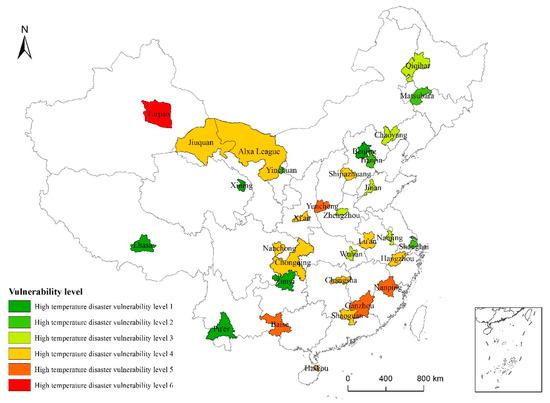 High-temperature vulnerability levels of 31 typical cities across China based on data from 1986 to 2015.