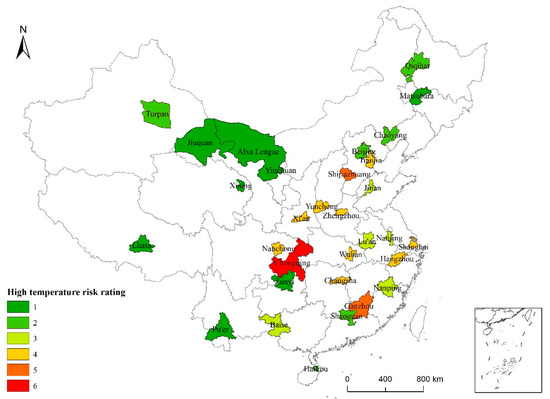 According to the high-temperature risk assessment model, the high-temperature risk values for the 31 cities were calculated and rated using the natural breakpoint method to obtain the spatial distribution map of high-temperature risk areas (Figure 7).