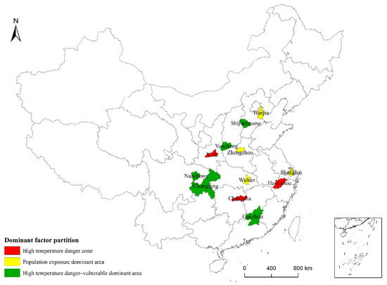 High-temperature risk dominant factor partition for 31 typical cities in China.