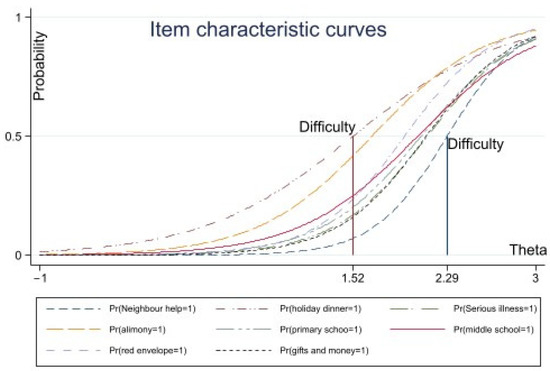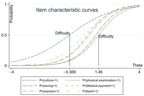 Related research pointed out that the estimated coefficients of the discrimination coefficient and the difficulty should be neither too small nor too large; the discrimination coefficient values range was usually situated between [0, 4] [48]. If the difficulty coefficient values range was usually between [−3, 3] [49] and if the difficulty parameter was negative it manifested that more than half of the rural households were likely to suffer from the deprivation of the item. In this article, the parameter estimation results showed that the coefficients of discrimination value and difficulty coefficients were in a reasonable range. In addition, based on the difficulty coefficient, the severity of the item was classified [50]. If the difficulty coefficient was in the range of [3, 0], [0, 1.5] and [1.5, 3], respectively, the severity of the item was divided into ‘lighter’, ‘medium’ and ‘severe’. The item characteristic curve (see Figure 1 and Figure 2) shows that the item ‘culture to the countryside’ could reflect that the social participation function is the lighter deprivation, the five items ‘annual physical examination’ and ’banking services’ and others could reflect the health, security function and opportunities for service are medium deprivation and the eight items ‘attend a desirable primary school nearby’, ‘serious illness to urban hospital’ and ‘giving red envelopes for Chinese New Year’, among others, are serious deprivation.
