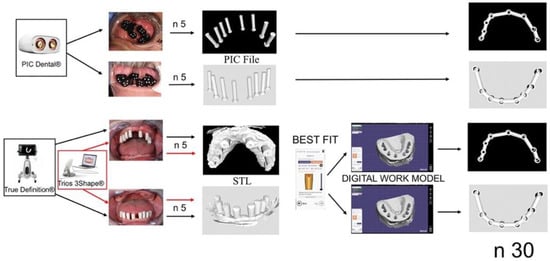 Overview: Three digital impression systems were evaluated in the present study; PIC dental (PIC), Trios (T), and True Definition (TD). For this, 5 impressions were taken per arch and system in one patient with 8 implants in each arch. Every STL was transformed in its corresponding digital working cast (Figure 1). A total of 30 digital suprastructures were designed. The Euclidean distances and angulations of the scan bodies were the analyzed variables. The measurements were performed in the design of the suprastructures [14,49,50] (Figure 2).
