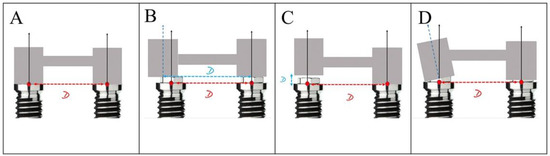 Representation of fit of suprastructure over two implants. (A) Ideal passive fit. (B) Misfit due to deviation on X axis between abutments. (C) Misfit due to deviation on Y axis between abutments. (D) Misfit due to variation of angulation between abutments, depending on the number of abutments involved in each prosthetic structure.