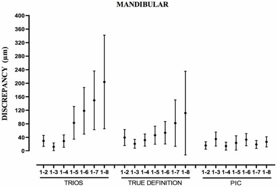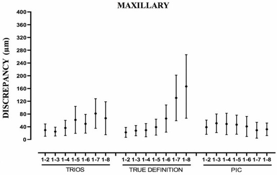 For the TD and T systems, when the distance between the abutments increased, the error of each parameter studied increased as well, being more evident between the Euclidean distances from pillar 1 to 8 (Table 4 and Figure 4, Figure 5 and Figure 6). In the TD system, a similar pattern was observed for both arches; however, T performed worse in the mandibular arch than in the maxillary arch. The IOS PIC was not affected by the increase in the distance between the abutments. The greatest difference between measurements for a segment in the maxillary arch (Table 1) was PIC 108.2 μm, T 220.6 μm, and TD 342.9 μm and for the mandibular arch (Table 2) PIC 104.4 μm, TD 269.0 μm, and T 476.4 μm.