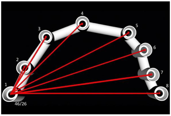 The designed suprastructure (n = 30) was exported in STL format to a reverse engineering software, Geomagic (Geomagic Inc., 3D Systems, Morrisville, NC, USA)) [52]. The central points of each abutment platform were calculated (n = 8). The vector that passes through those points following the rotational axis of each abutment was calculated as well. The Euclidean distances were calculated connecting the central points between the segments, creating all possible combinations per suprastructure (n = 28). The relative angulations were calculated in degrees using the vectors of each abutment. The axis (0, 0, 0) was selected in the abutments corresponding to implant 46 in the mandibular arch and 16 in the maxillary arch. That same abutment was determined as (0, 0, 1) to calculate the angulations; in this way, abutments 46 and 26 were the reference to calculate the 7 remaining angulations (Figure 2). The Euclidean distances and angulations were calculated individually (one by one).
