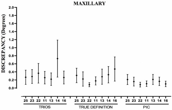 The distances of the 28 segments were compared between the different IOSs (PIC, T, and TD) Significant differences were found in Euclidean distances when comparing PIC–T in 14 segments for the maxillary arch and 11 for the mandibular arch. When comparing PIC–TD, 14 segments were different in the maxillary and 11 in the mandibular. Comparing TD–T, 11 segments were different in the maxillary and in the mandibular (Table 7).