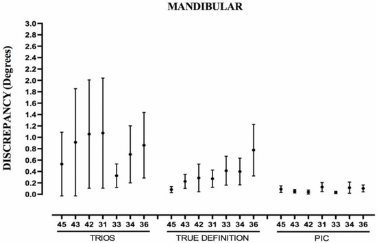 Descriptive statistics for each of seven relative angulations (degrees) of mandibular arch obtained with the three evaluated systems.
