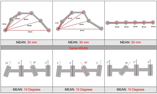Analysis of trueness/precision calculated with each distance individually is more representative of real distortions than the means. See in the image that the same mean error can mean very different level of individual deviations, with very different clinical implications.