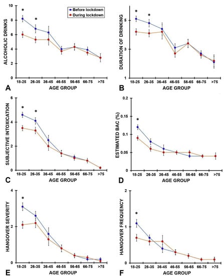 Alcohol consumption outcomes according to age group. Significant differences (p < 0.05) between before lockdown and during lockdown are indicated by *. Abbreviations: BAC, blood alcohol concentration.