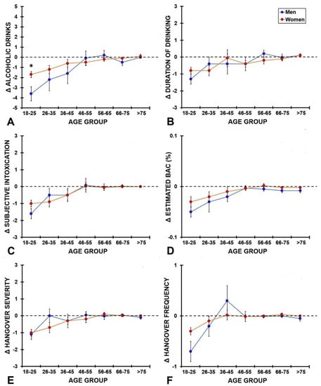 Interactions between age group and sex. Difference scores (Δ, during lockdown–before lockdown) are presented. Significant differences (p < 0.05) between men and women are indicated by *. Abbreviations: BAC, blood alcohol concentration.