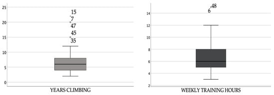 Frequency of years climbing and hours of training. YEARS CLIMBING (the values of the first and third quartiles are 4 and 8, respectively, with a median of 6. The upper whisker is 22, while the lower whisker is 2. Its mean is 7.06); WEEKLY TRAINING HOURS (the values of the first and third quartiles are 5 and 8, respectively, with a median of 6. The upper whisker is 25, while the lower whisker is 3. Its mean is 6.60), extreme cases.