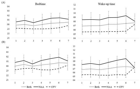Mean scores of bedtime and wake-up time during a 7-day workweek among pilots in the Norwegian Air Ambulance (NAA; n = 25), Christophorus Flugrettungverein (CFV; n = 22), and both groups collapsed, measured by (A) sleep diary and (B) actigraphy. Error bars represent standard deviations.